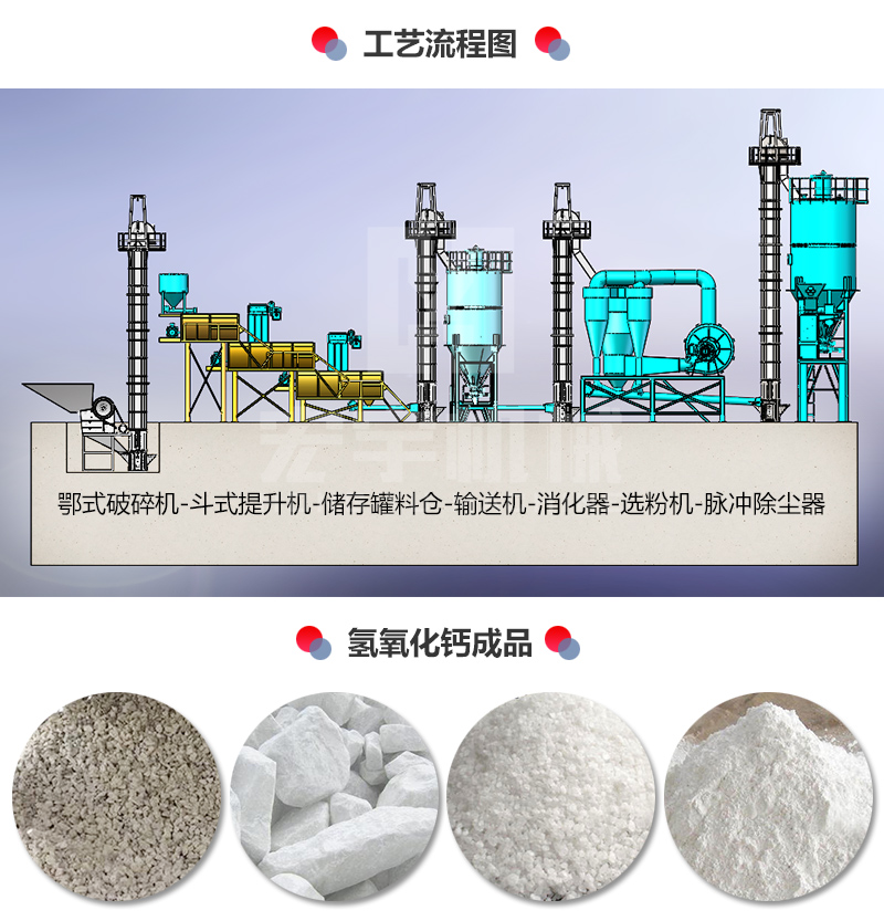 將合格的氧化鈣(CaO)塊料由鄂式破碎機(jī)破碎至20mm左右粒度,經(jīng)斗式提升機(jī)送入氧化鈣儲(chǔ)存罐料倉(cāng),料倉(cāng)中的氧化鈣經(jīng)穩(wěn)流輸送機(jī)定量穩(wěn)重系統(tǒng)進(jìn)入氫氧化鈣Ⅰ級(jí)消化器進(jìn)行初步消化,當(dāng)氫氧化鈣完成初級(jí)消化以后進(jìn)入Ⅱ級(jí)消化或Ⅲ級(jí)消化器,使氧化鈣消化分解,生成合格的氫氧化鈣初級(jí)產(chǎn)品,消化率達(dá)到98%,(消化系統(tǒng)根據(jù)產(chǎn)能要求,機(jī)型設(shè)計(jì)分為單軸、雙軸及多軸機(jī)型)。消化分解好的氫氧化鈣再由半成品螺旋輸送機(jī)送入選粉機(jī)內(nèi),由選粉機(jī)完成產(chǎn)品雜質(zhì)分離和細(xì)度分級(jí),完成分級(jí)后的終端合格產(chǎn)品,由成品輸送機(jī)、提升機(jī)卸入成品氫氧化鈣罐倉(cāng)進(jìn)行分別包裝。本套生產(chǎn)線所有污染節(jié)點(diǎn)由脈沖除塵器完成,收塵率達(dá)到99.5%。