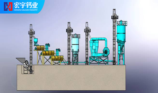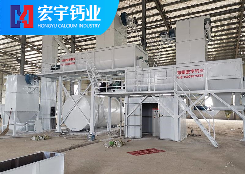 將合格的氧化鈣(CaO)塊料由鄂式破碎機破碎至40mm左右粒度,經斗式提升機送入氧化鈣儲存罐料倉,料倉中的氧化鈣經穩(wěn)流輸送機定量穩(wěn)重系統(tǒng)進入氫氧化鈣Ⅰ級消化器進行初步消化,當氫氧化鈣完成初級消化以后進入Ⅱ級消化或Ⅲ級消化器,使氧化鈣消化分解,生成合格的氫氧化鈣初級產品,消化率達到98%,(消化系統(tǒng)根據(jù)產能要求,機型設計分為單軸、雙軸及多軸機型)。消化分解好的氫氧化鈣再由半成品螺旋輸送機送入選粉機內,由選粉機完成產品雜質分離和細度分級,完成分級后的終端合格產品,由成品輸送機、提升機卸入成品氫氧化鈣罐倉進行分別包裝。本套生產線所有污染節(jié)點由脈沖除塵器完成,收塵率達到99.5%。